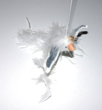 Teaser toy with wooden handle, bell and seagull.